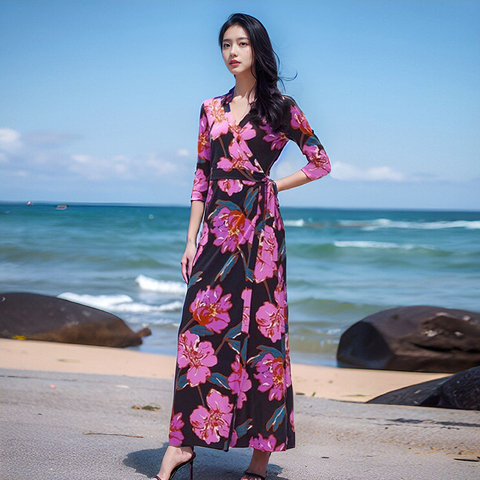 Maxi abito da donna con cinturino sottile stampato bohémien traspirante per le vacanze estive ispirato allo Yunnan Dali